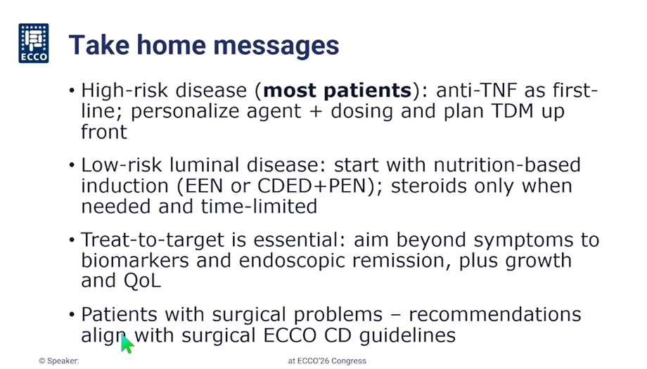 The upcoming ECCO-ESPGHAN guidelines on the medical management of pediatric CD recognize that nutrition-based induction remains first-line for low-risk luminal disease. In high-risk patients, nutritional therapy (an only-liquid diet or the Crohn’s Disease Exclusion Diet plus nutritionally complete formulas) may serve as a bridge/adjunct while arranging anti-tumor necrosis factor treatment. If surgery is needed, it is important to optimize first and then prevent recurrence. Nutrition is key to better long-term outcomes and infection control. Addressing growth, nutrition (i.e., vitamin D deficiency and anemia), bone health, and psychosocial needs continuously is also important.