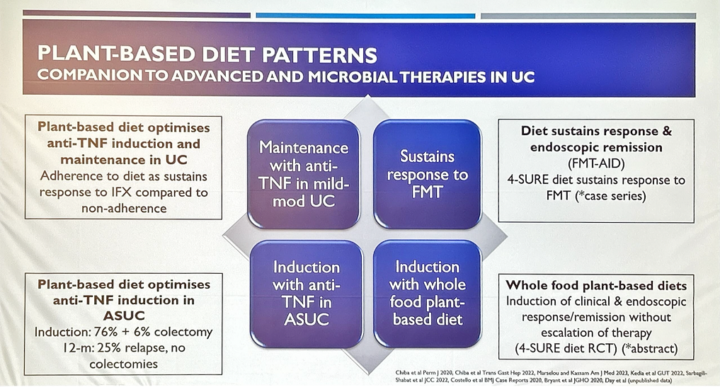 The best diet for ulcerative colitis (UC) is currently unknown. Alice Day, RD, PhD, from the Queen Elizabeth Hospital (Australia), updated the knowns and unknowns on the role of whole-food diets in igniting or extinguishing inflammation in UC. Recent findings from the PREdiCCt trial in patients with UC in remission revealed that higher habitual total meat intake is associated with a double risk of an objective flare, with the strongest signals for unprocessed red and white meat, while fish is not associated with flare risk10. In contrast, fiber from fruits and vegetables may be protective against the development of UC11, while fiber supplements are not enough to correct the altered gut microbiome in UC12. A Mediterranean diet pattern is associated with the maintenance of clinical remission and reduced fecal calprotectin in patients with inactive UC through favouring protective gut bacteria and increasing short-chain fatty acids while downloading pro-inflammatory metabolites13,14.
