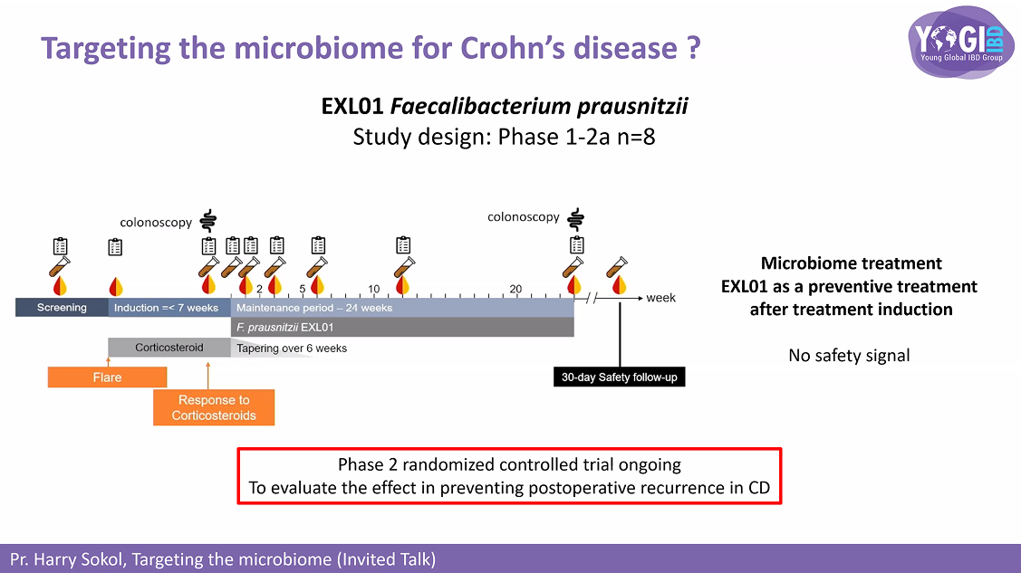 Dietary interventions such as probiotics, prebiotics and postbiotics may likely offer a benefit for patients with IBD by reducing the inflammation in the gut epithelium and reinforcing gut integrity20. This translates into potential benefits of probiotics, prebiotics, and synbiotics in inducing IBD remission and improving UC activity, but not in preventing IBD recurrence or improving CD disease activity21. When it comes to fecal microbiota transplantation, Harry Sokol, MD, PhD, from Saint-Antoine Hospital (Paris), acknowledged that it is not a scalable therapy and the way forward might be administering single strains. One of the most investigated bacterial strains in Crohn’s is EXL01 Faecalibacterium prausnitzii, which has shown in a phase 1-2a clinical trial is safe and led to changes in the expression of ileal genes involved in the pathogenesis of Crohn’s (i.e., a decrease in the genes involved in inflammatory response dependent on mitochondria respiration)22. A phase 2 randomized clinical trial is ongoing to evaluate the effects in preventing postoperative recurrence in CD.